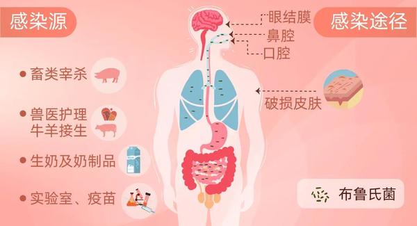布鲁氏菌可通过皮肤黏膜、消化道和呼吸道感染人体,一般通过接触病畜排泄物、皮毛、接羔等,食用未煮熟的羊肉、未经巴氏或高温灭菌的生奶及奶制品,或者通过实验室、疫苗暴露等方式感染。