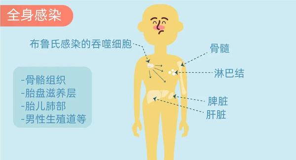 一旦适应了吞噬细胞内的环境,实现在细胞内的繁殖和滞留,布鲁氏菌便会寄居在被感染的吞噬细胞里,随着淋巴系统向全身转移,感染其他靶细胞/组织,包括网状内皮系统(分布在肝、脾、骨髓、淋巴结等的单核巨噬细胞)、骨骼组织、胎盘滋养层、胎儿肺部、男性生殖道等。