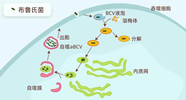 布鲁氏菌在被吞噬后,形成BCV液泡(Brucella-containing vacuole),虽然还是会迅速与溶酶体融合并且被分解,却能够让大约10%的细菌在细胞自噬中存活下来,名副其实的九死一生。存活的细菌抵达吞噬细胞的内质网,建立增殖的小生态位,BCV液泡转化成允许细菌复制的液泡rBCV,细菌开始大量复制。复制完成后,rBCV再转变成自噬液泡aBCV,增殖后的细菌就呆在自噬液泡中,等待感染其他靶细胞/组织。