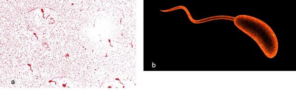 图3. a. 用 Leifson 鞭毛染色液染色的霍乱弧菌。b.霍乱弧菌概念图。来源:美国疾控中心