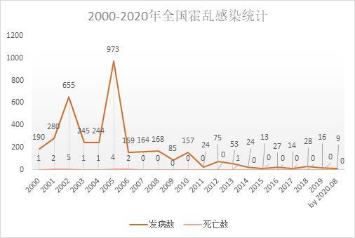 图3. 2000-2020年全国霍乱感染统计图,数据来源:疾病预防控制局和中国统计年鉴