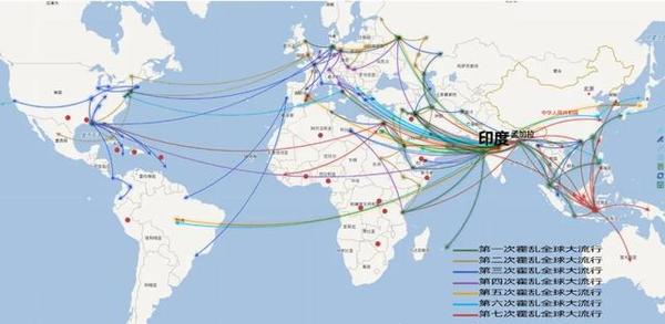 这种古老的疾病,在19世纪英国殖民者征服印度的时候,成功挣脱封“印”,在之后的200年里,时不时在各大洲乱窜。到目前为止,霍乱的全球大流行已达7次,大多从印度开始,传播范围不一(图1)。