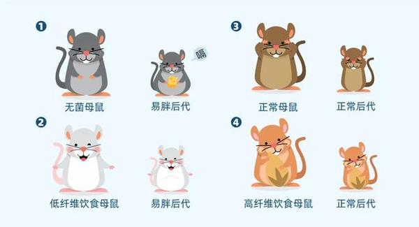 饮食是影响肠道菌群的关键因素。在另一组对比研究中,低纤维饮食的母鼠生下的宝宝出现了像无菌母鼠后代同样的症状,容易肥胖和出现代谢问题。而高纤维饮食母鼠生下的小鼠即使出生时体重偏高,但日后吃高脂肪食物也不易发胖。