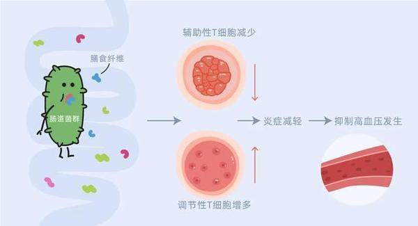 2018年,发表在美国心脏协会(AHA)期刊《Circulation》的一项研究显示,丙酸盐能让免疫系统中过于活跃的辅助性T细胞“平静”下来,减少因辅助性T细胞增强炎症而诱发的高血压,改善血管和心脏健康。而丙酸盐由肠道菌群通过消化天然膳食纤维产生。